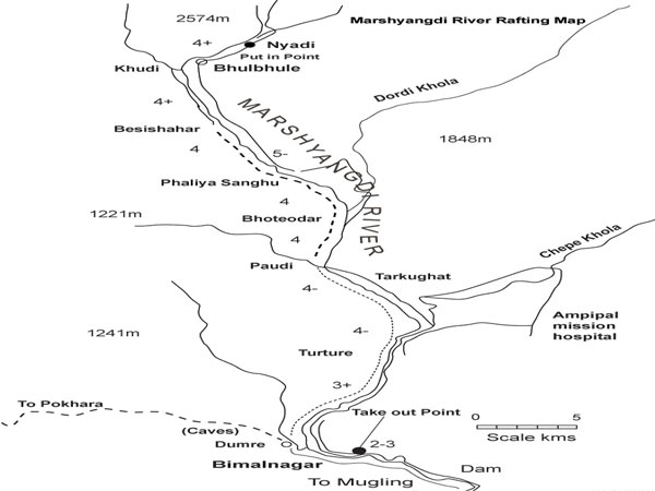 Nagdi, the put in point for the Marsyangdi River is 6 hours west of Kathmandu by bus followed by a 1 day trek to the river side. Porters transport all the rafting equipment and other necessities for the trip. Transportation from Pokhara can also be arranged. The 65km of river action takes 4 days . Bus transportation is provided from the take-out point at Bimalnagar to either Kathmandu (5 hours) or Pokhara (2 hours). There is a orientation meeting early in the evening before the trip, providing you with an opportunity to ask any further questions you may have, to meet your fellow rafters and also your guide.